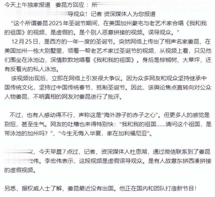 老杜传媒-杜恩湖|今天上午独家报道 姜昆方回应 :所谓姜昆和艺术家们在美国过圣诞节, 是有人故意恶搞拼接虚假视频误导观众!