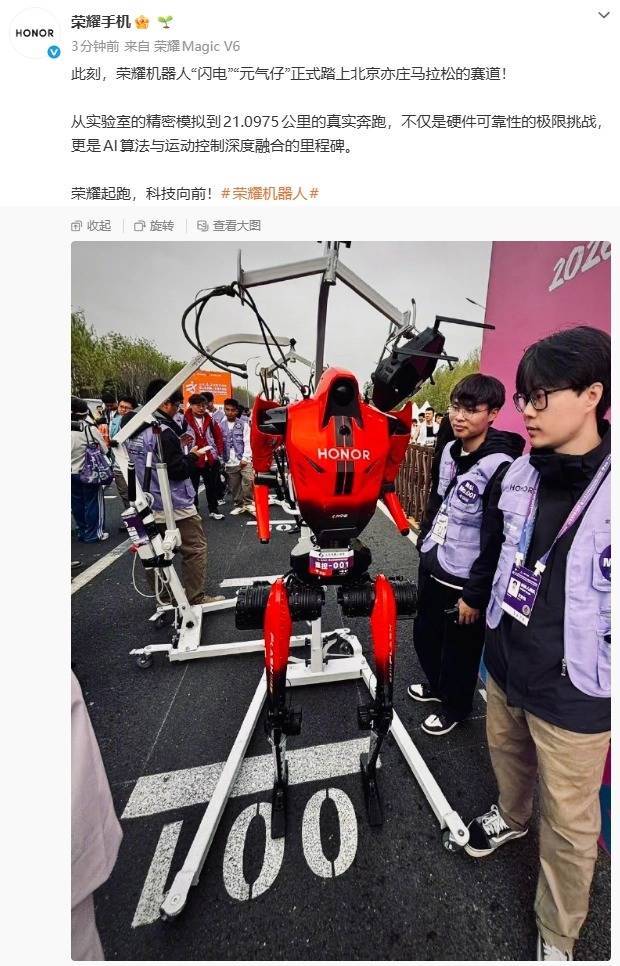 IT之家 4 月 19 日消息,今日 7:30,由北京市人民政府、中央广播电视总台等联合主办的 2026 人形机器人半程马拉松在北京亦庄正式开跑。来自北京荣耀的绝影赤兔队率先开跑,该战队的参赛机器人为“闪电”。
