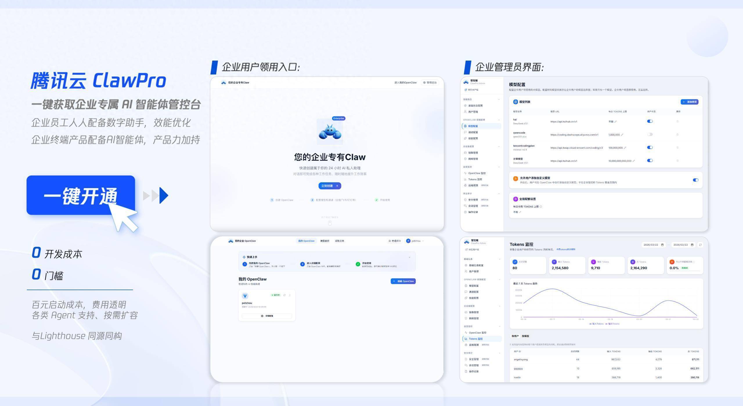 ClawPro是国内首个基于百万级用户验证的一站式企业AI智能体管控平台。它为企业提供专属的AI Agent平台,让企业管理员可以统一部署 OpenClaw模板、下发模型资源配额并进行监测。